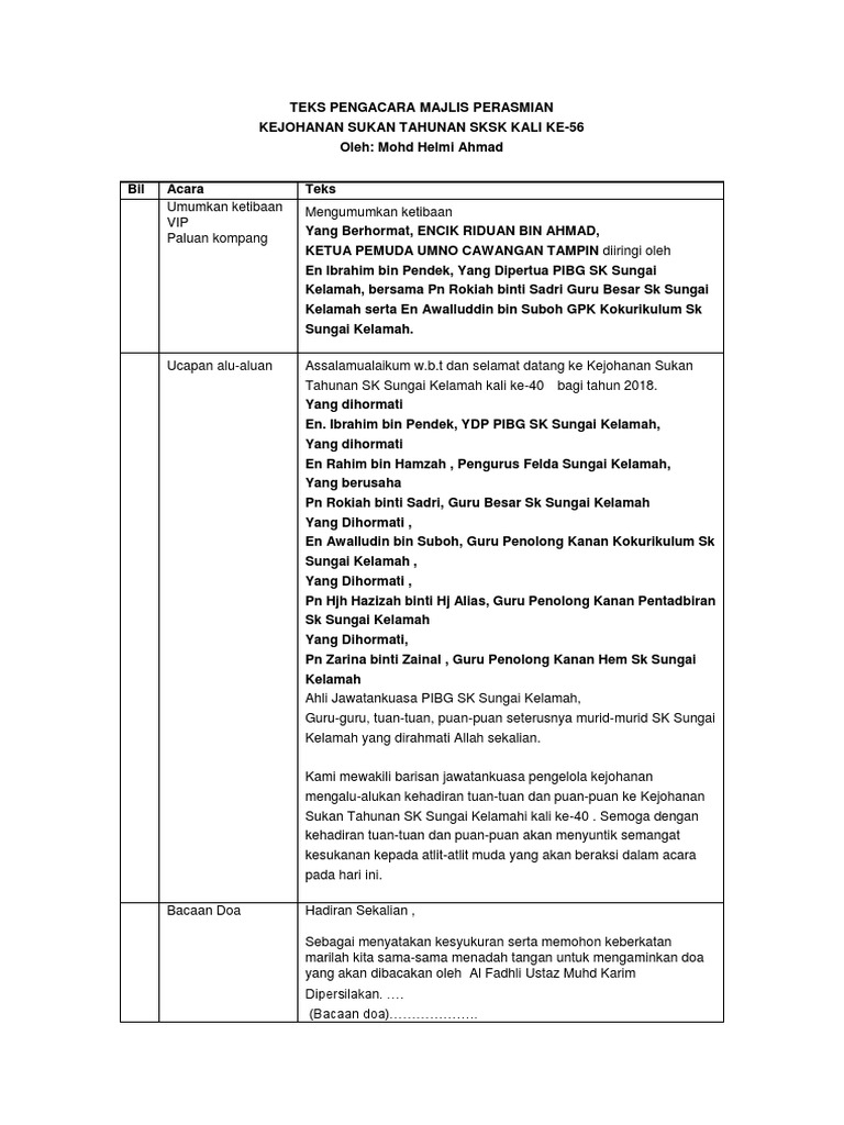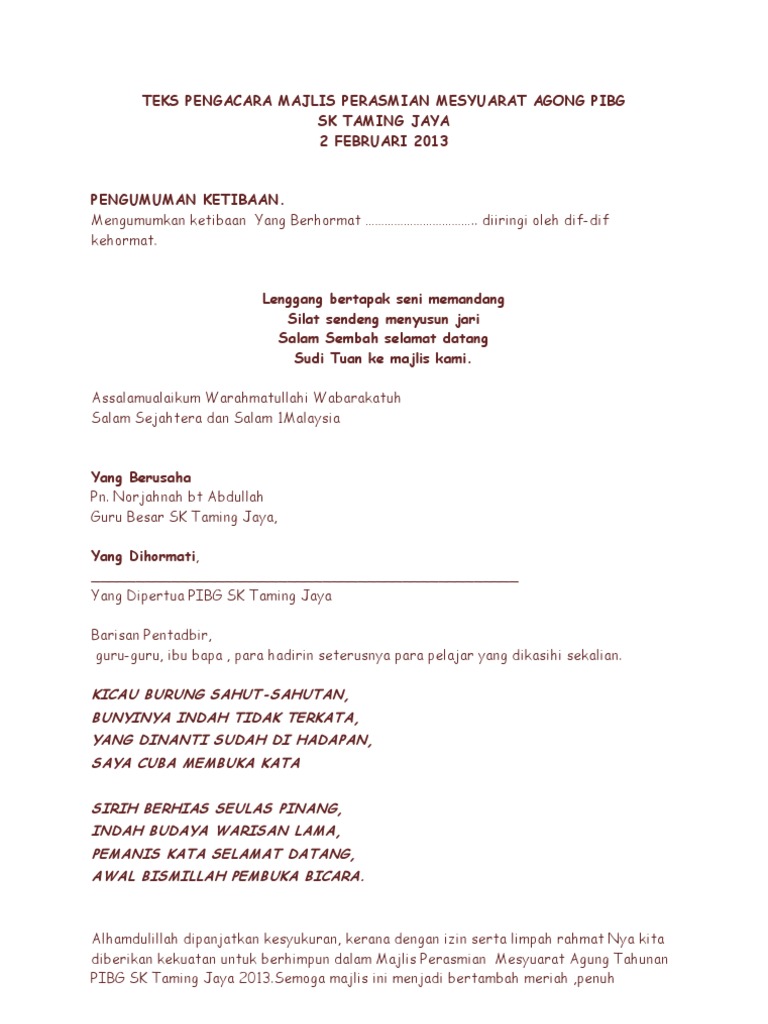 Teks Pengacara Majlis Perasmian Mesyuarat Agung Pibg from imgv2-1-f.scribdassets.com Teks_ucapan_perasmian_ybhg._dato_sri_dr._ali_bin_….pdf is hosted at www.ksn.jpm.gov.my since 0, the book teks ucapan perasmian you can find and download others pdf ebooks ,user's guide and manuals about manual teks ucapan perasmian ybhg. Teks ucapan perasmian speakers corner yang berbahagia. Syabas dan tahniah kepada semua. Contoh teks ucapan perasmian english in camp. Teks pengacara majlis formal 1. Seterusnya, majlis menjemput en saupi, merangkap sebagai timbalan ketua pegawai eksekutif syarikat untuk mengiringi en muhammad yusri naik ke atas pentas untuk menyempurnakan acara perasmian majlis makan. Bukan mudah untuk menjadi pengerusi majlis yang berjaya. Abdul rahim bin ismail, pengerusi lembaga kemajuan tanah negeri sabah, merangkap adun n.22 pantai manis.